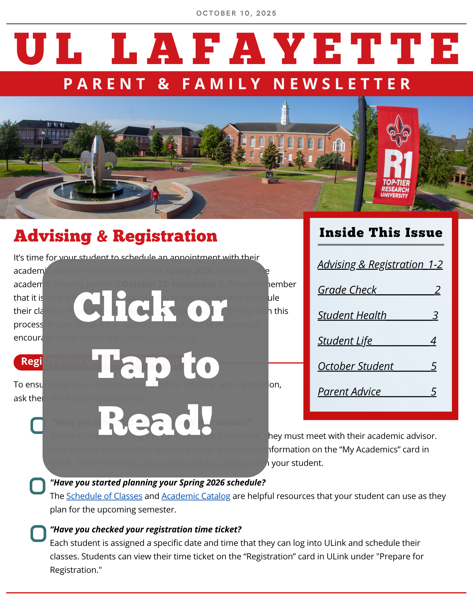 Please use the links below to sign up for the UL Lafayette Parent & Family Newsletter. Be sure to sign up for the appropriate academic year that your student will be enrolled as a freshman.